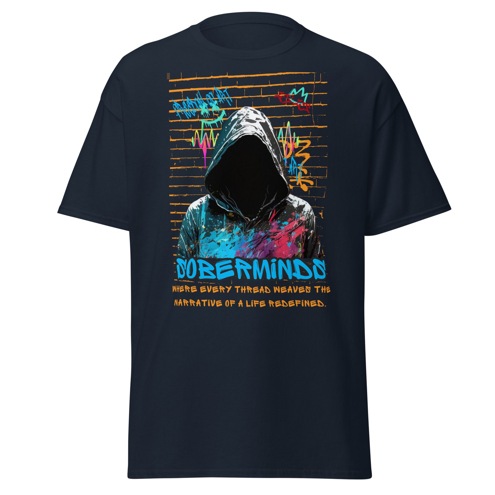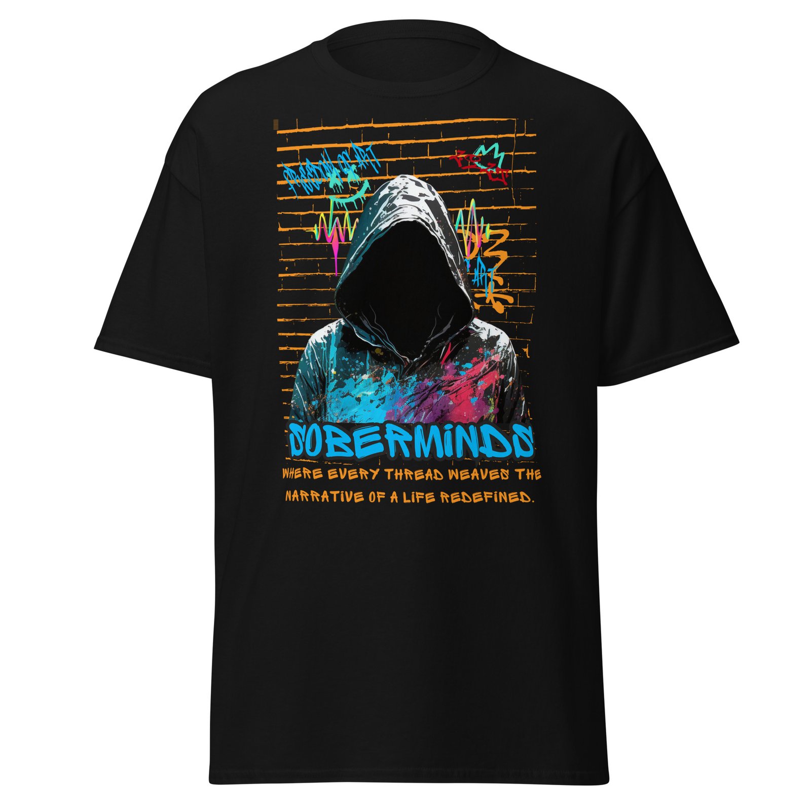 Every stitch tells a story. The Soberminds® “Life Redefined” Tee embodies transformation, resilience, and urban grit. Featuring a hooded figure splashed in electric blue and magenta graffiti against a brick wall backdrop, this design represents the powerful act of rewriting your narrative.