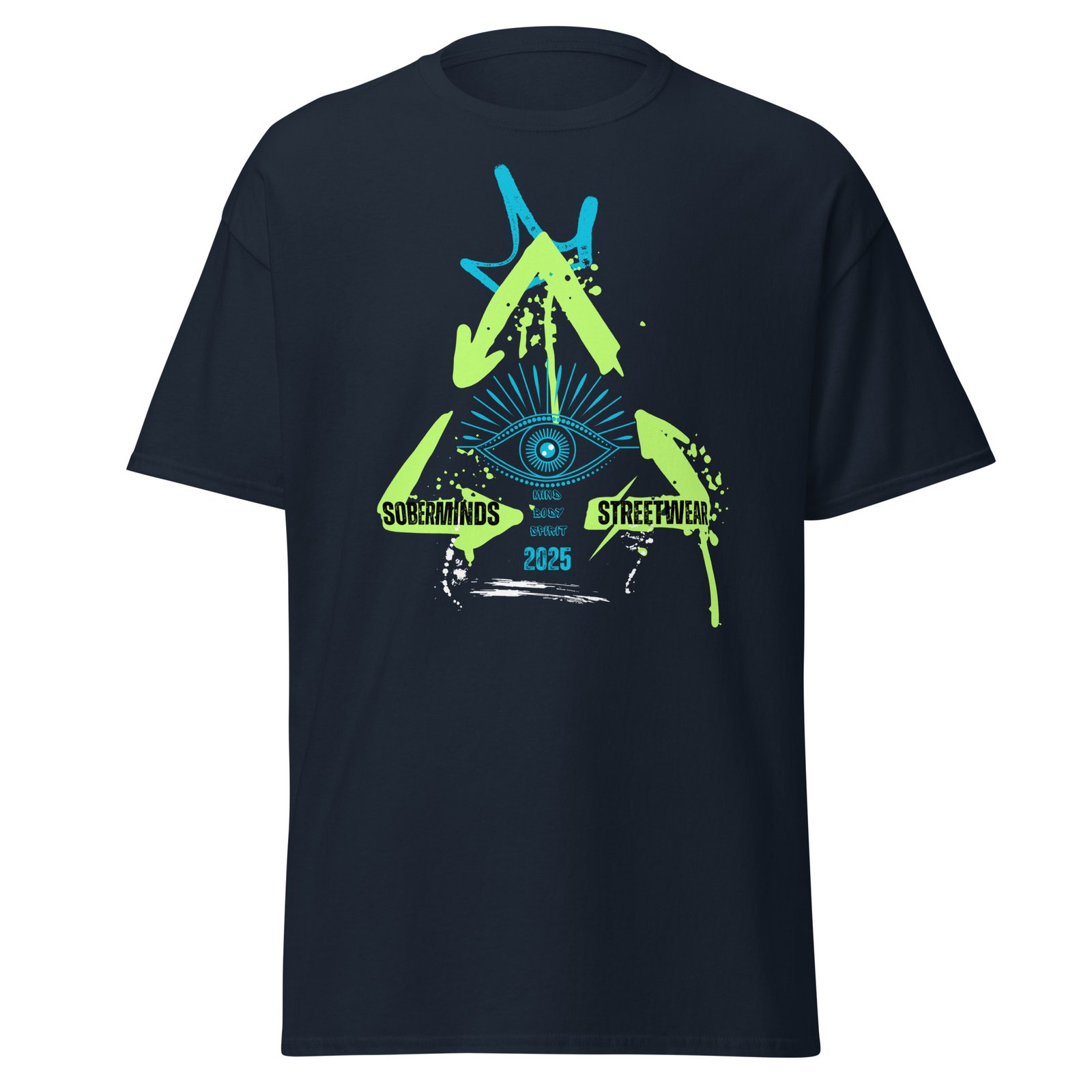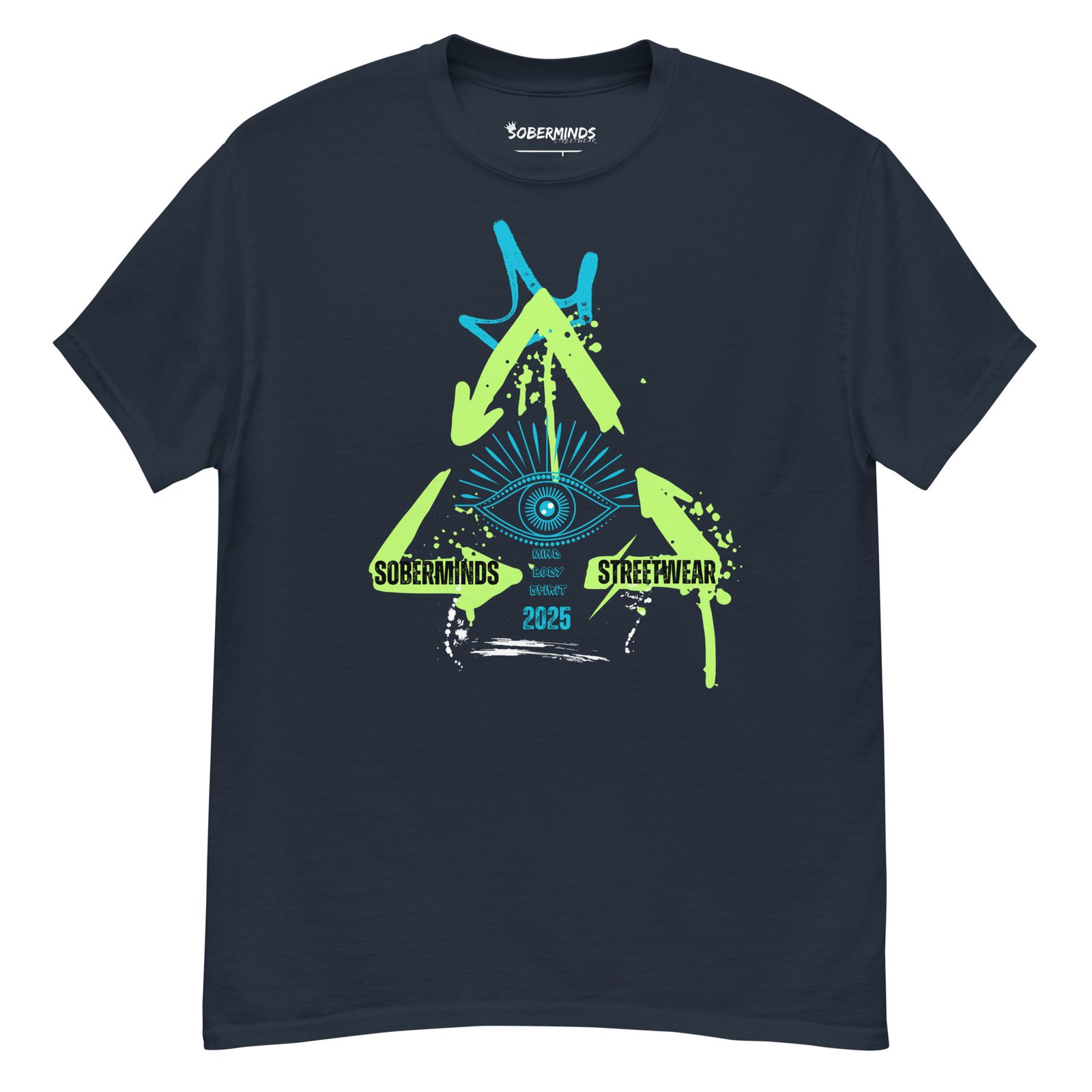 Step into the future of bold streetwear with the Soberminds® Streetwear 2025 Tee. Designed with neon green and electric blue accents against a deep black backdrop, this shirt makes a statement that cannot be ignored. The central all-seeing eye surrounded by dynamic arrows represents vision, awareness, and forward movement—a perfect symbol for those building their own path. The 100% cotton unisex classic tee will help you land a more structured look. It sits nicely, maintains sharp lines around the edges, and goes perfectly with layered streetwear outfits. Plus, it’s extra trendy now!