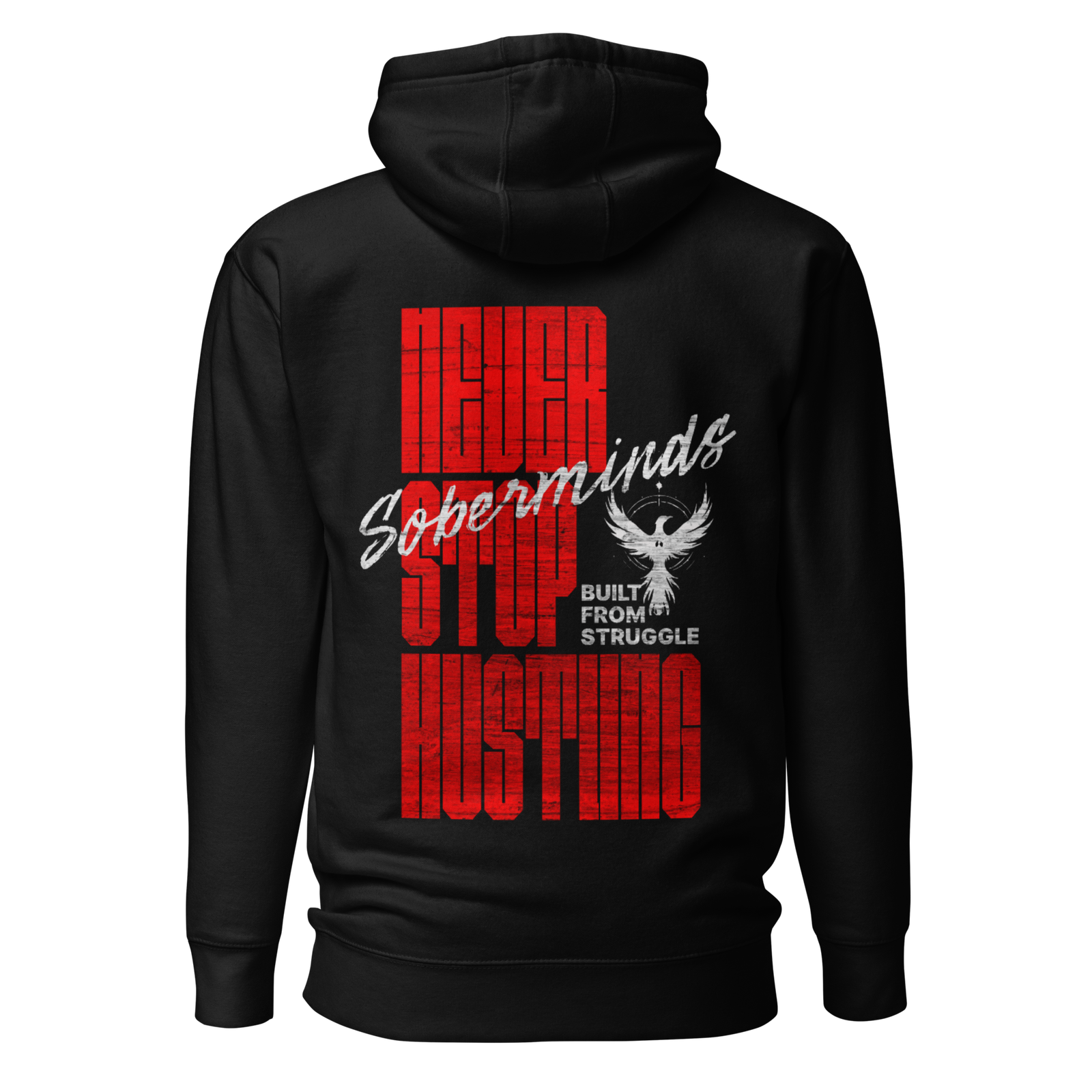 Featuring towering red block lettering layered with the iconic Soberminds script, this shirt sends a message of relentless forward movement. At the center sits the phoenix — the symbol of rebirth — with the words “Built From Struggle”, reminding you that every setback, every downfall, and every moment of pain has shaped the powerful person you are today.