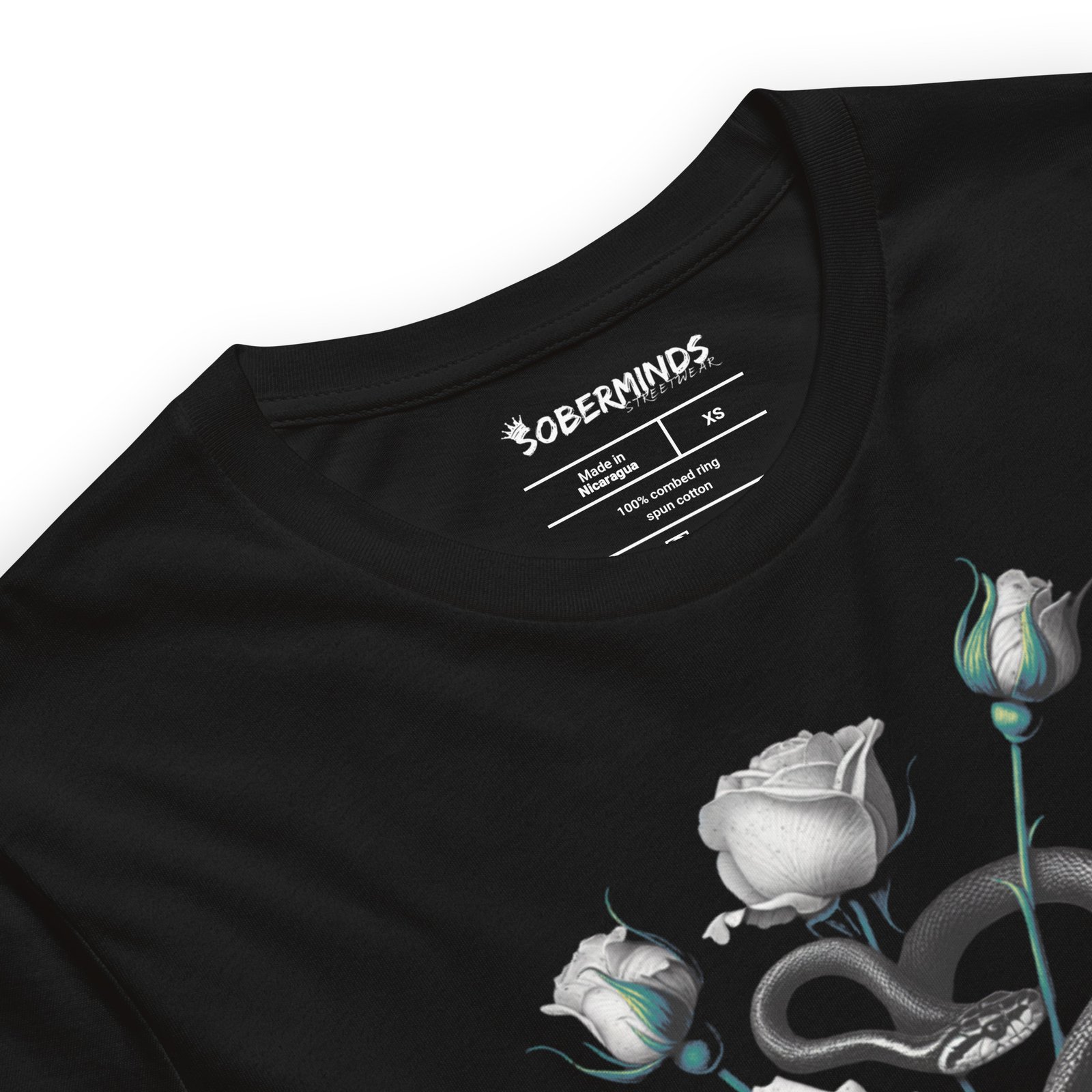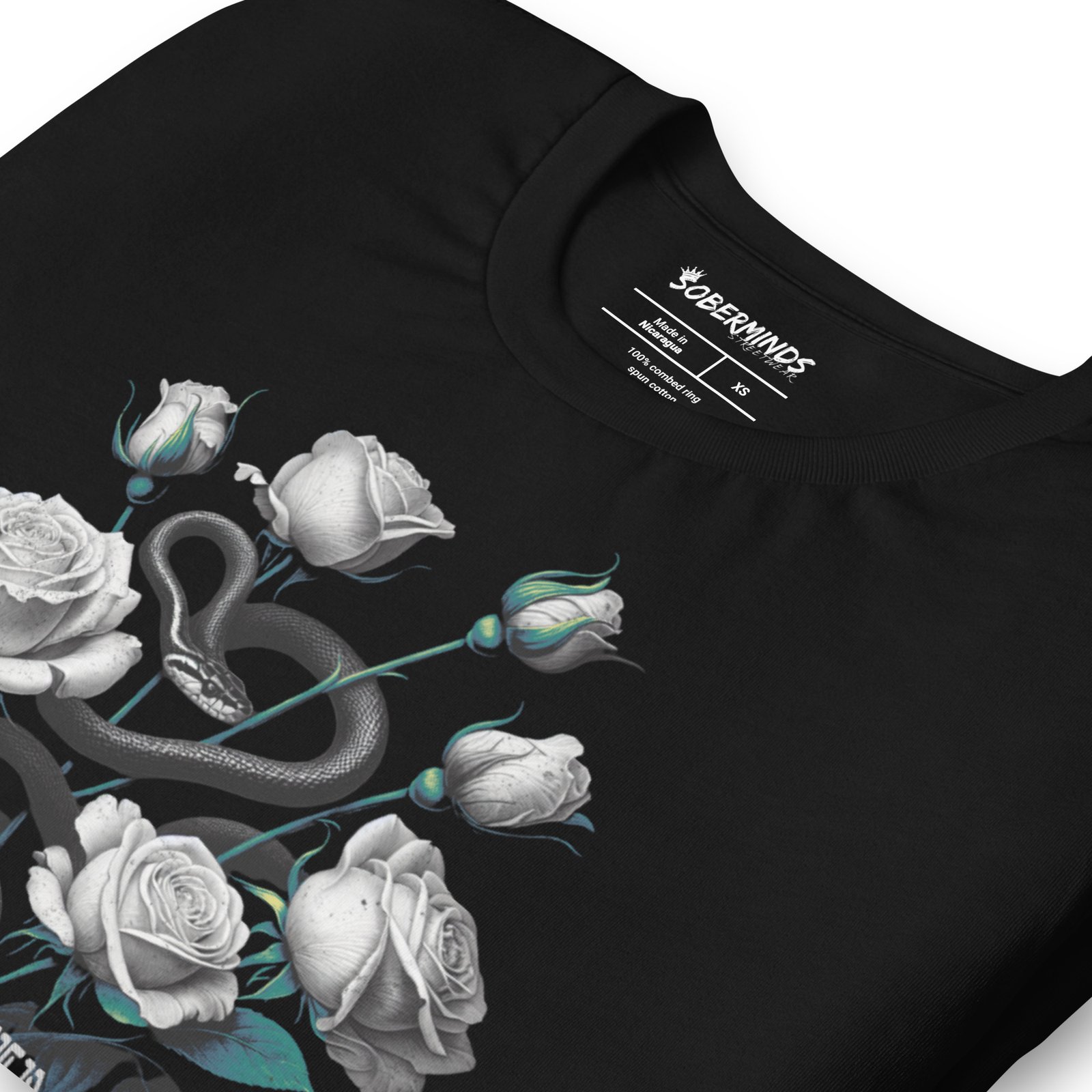 Soberminds “Roses & Serpent – Mind • Body • Spirit” Tee. A powerful rebirth design symbolizing growth, healing, and inner transformation. Shop Soberminds streetwear.