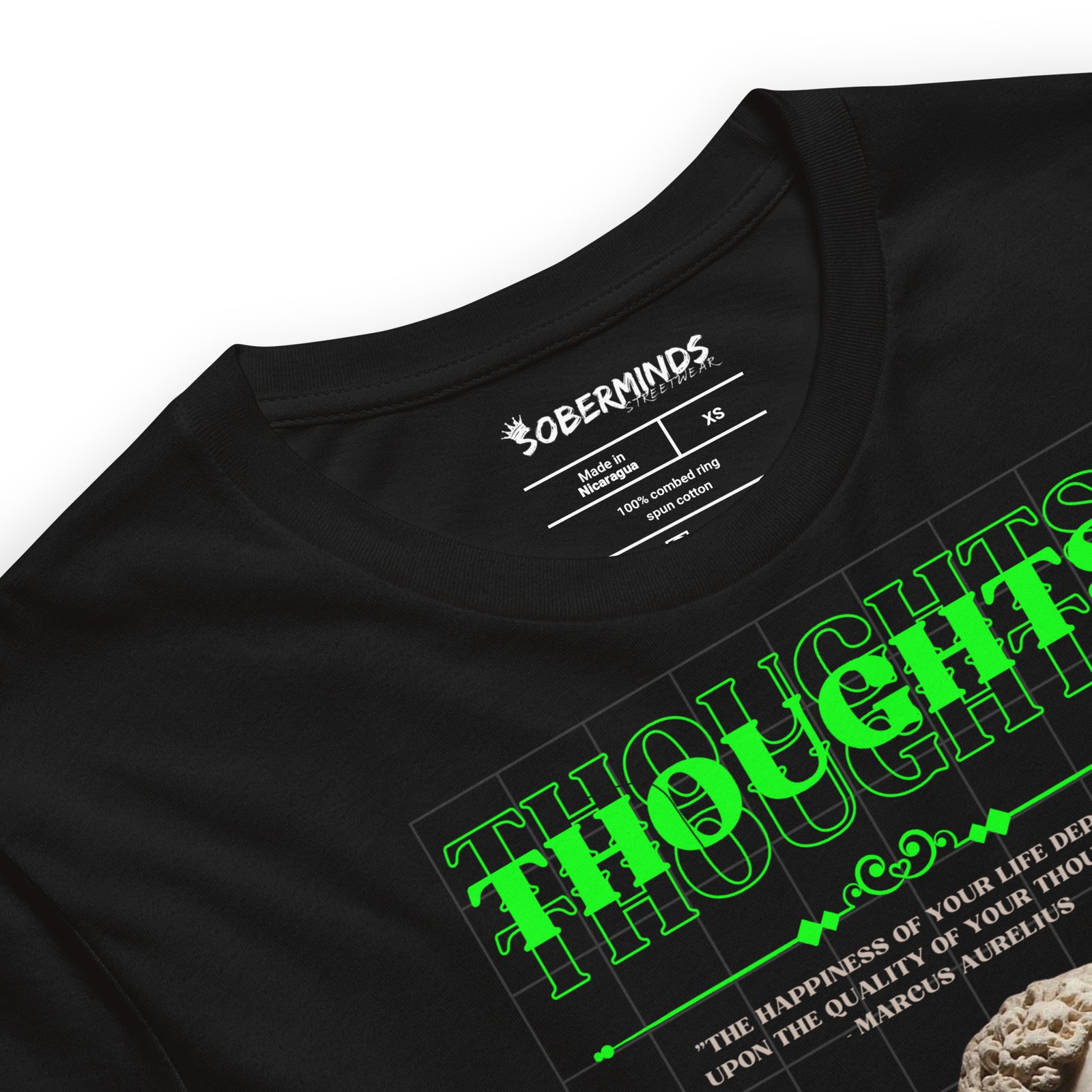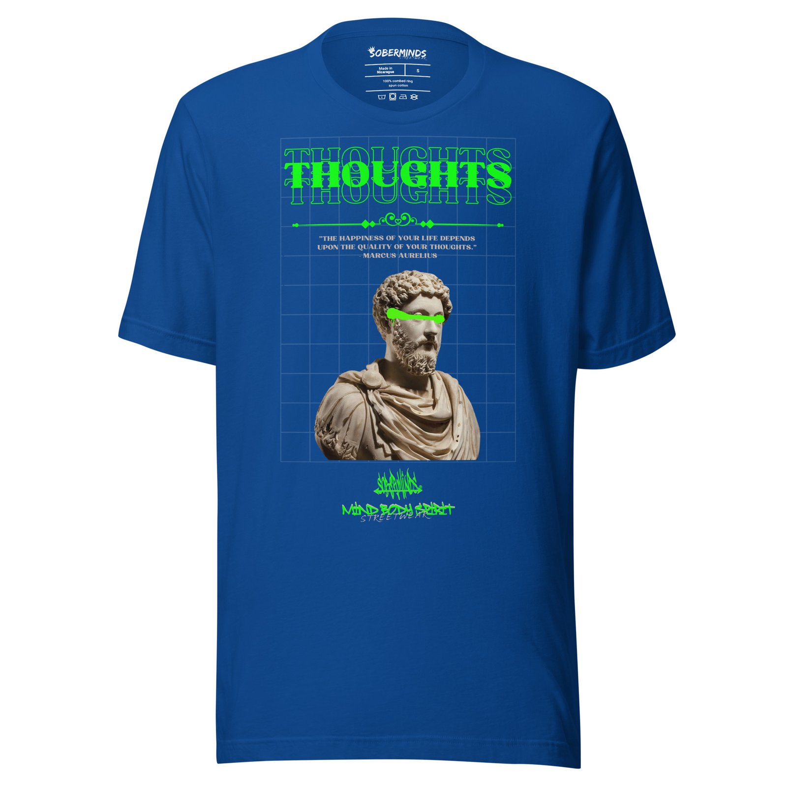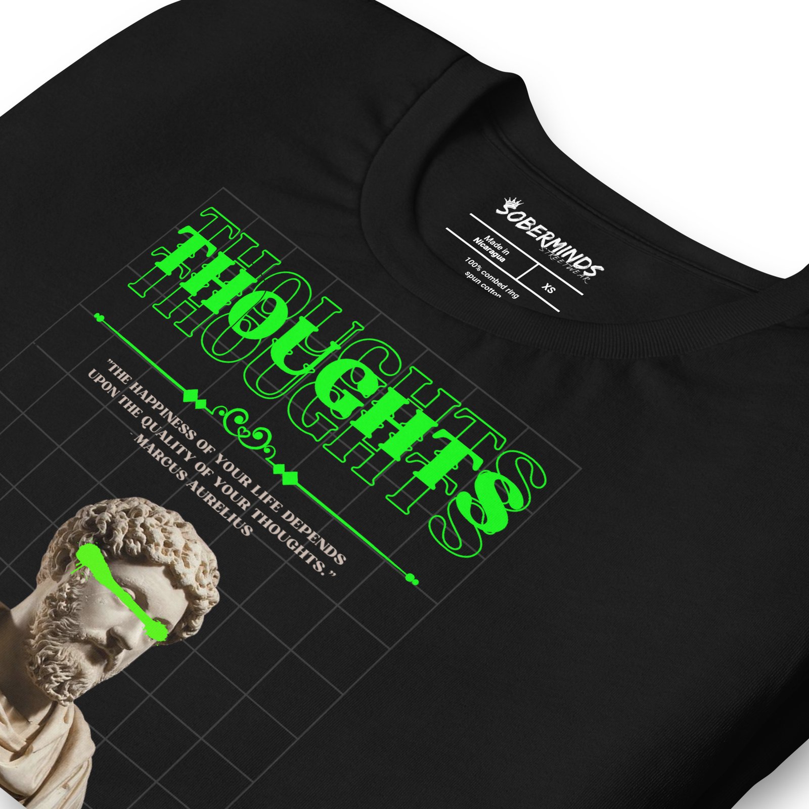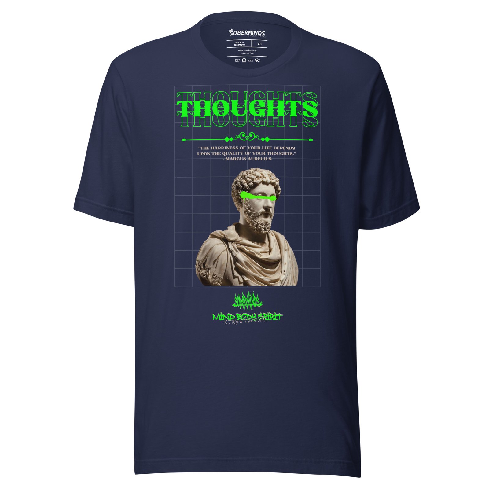 Your mindset shapes your world. The Soberminds® “Quality of Thoughts” Tee is a tribute to the timeless wisdom of Marcus Aurelius: “The happiness of your life depends upon the quality of your thoughts.” Featuring a striking bust of the Stoic emperor with neon green highlights and a futuristic grid backdrop, this tee blends ancient philosophy with bold streetwear energy. The 100% cotton unisex classic tee will help you land a more structured look. It sits nicely, maintains sharp lines around the edges, and goes perfectly with layered streetwear outfits. Plus, it’s extra trendy now!