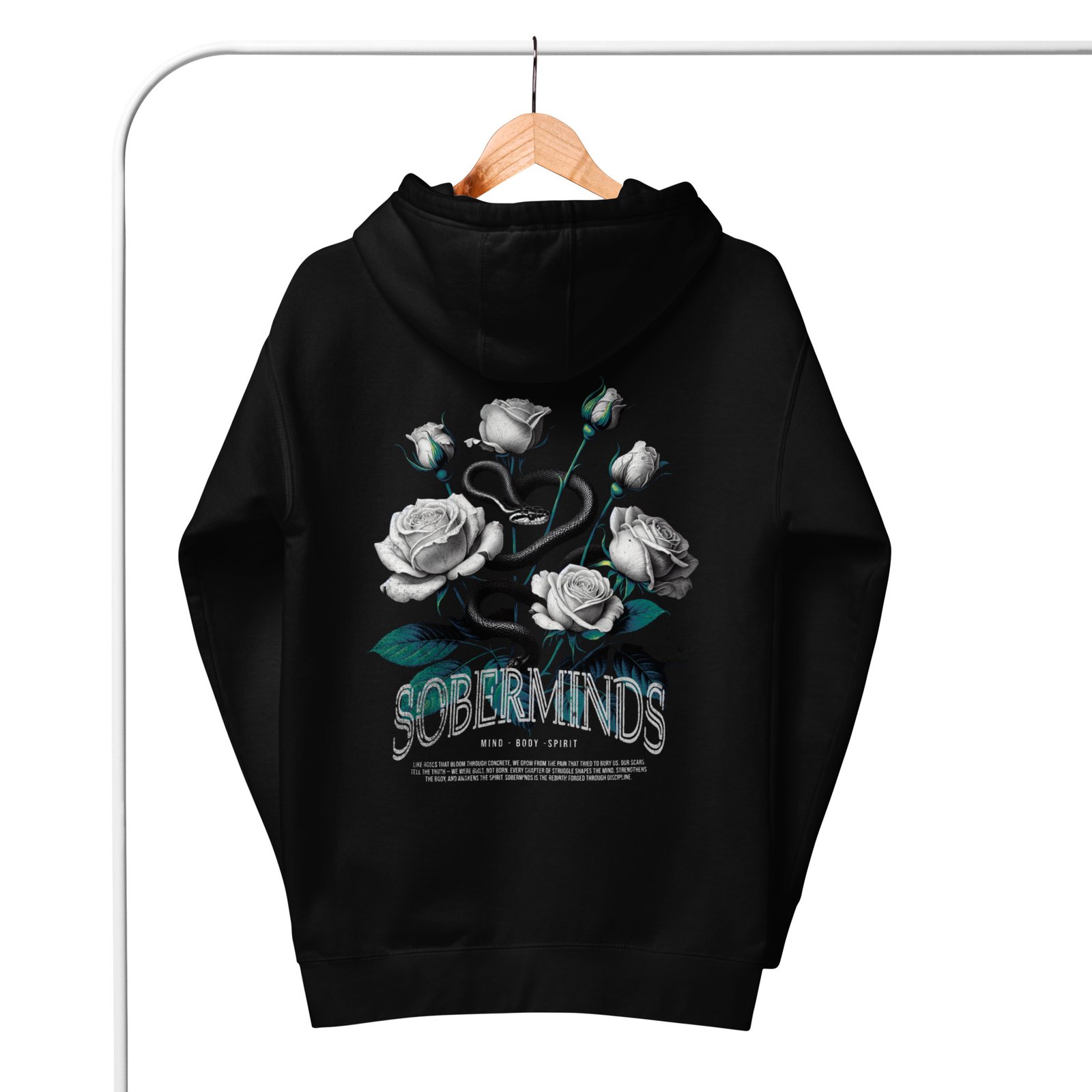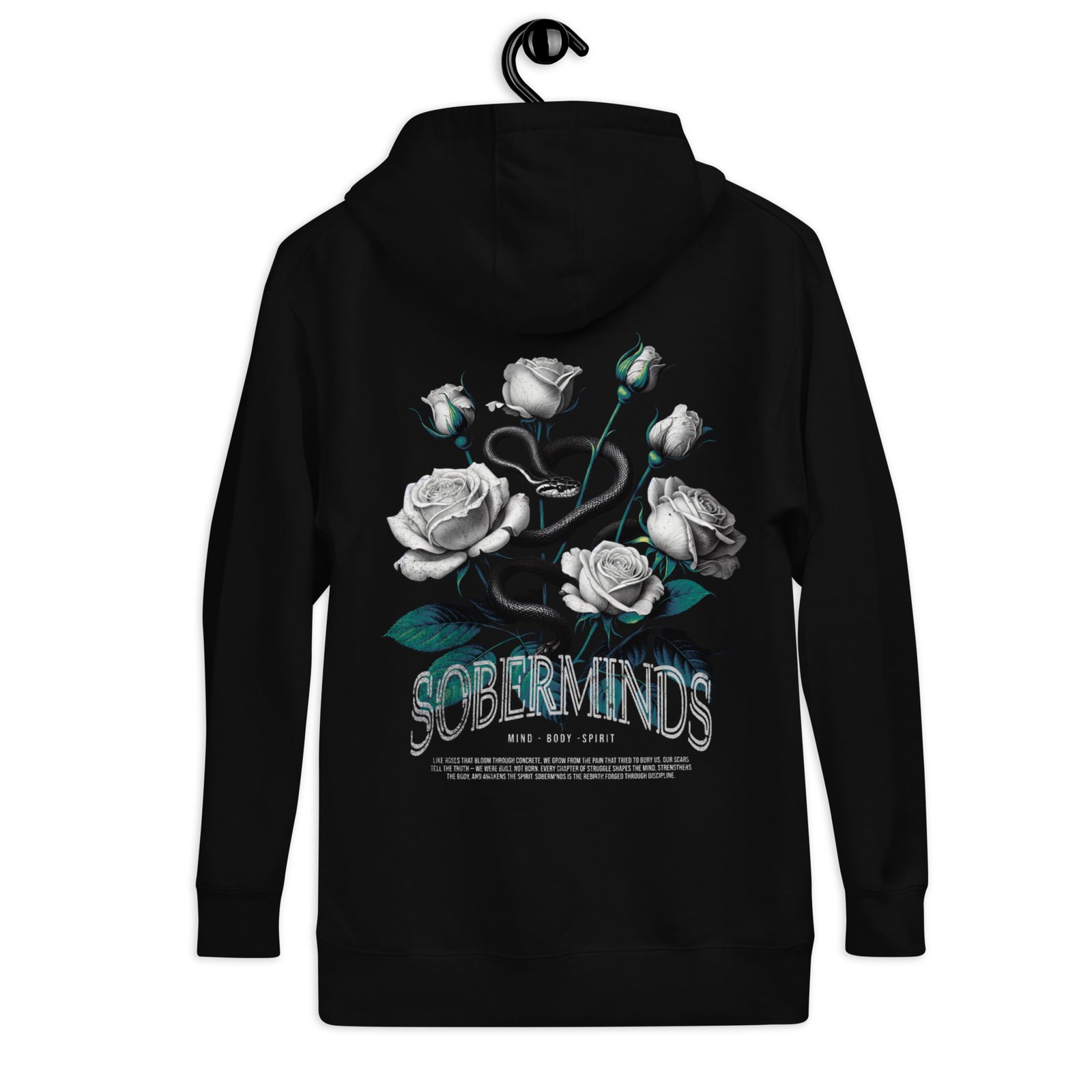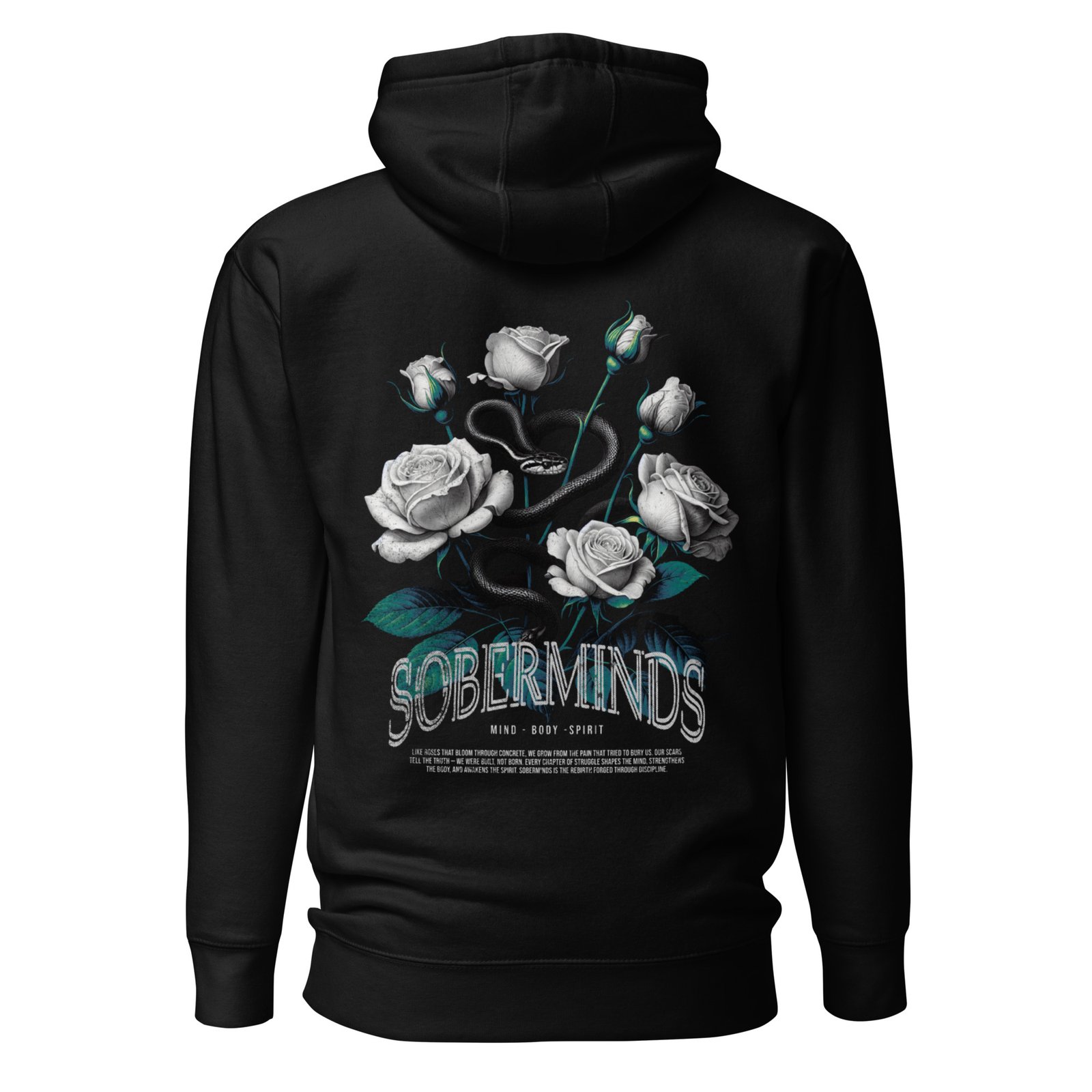 The Soberminds “Roses & Serpent – Mind • Body • Spirit” Tee blends powerful symbolism with the raw transformation that defines the Soberminds lifestyle. Featuring white roses, a coiled serpent, and deep teal accents, this design represents rebirth, discipline, and the inner awakening that happens when you shed your old identity and step into who you were meant to become.